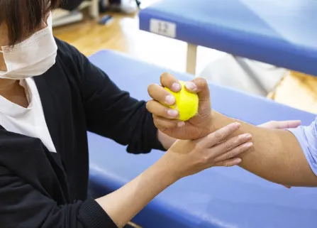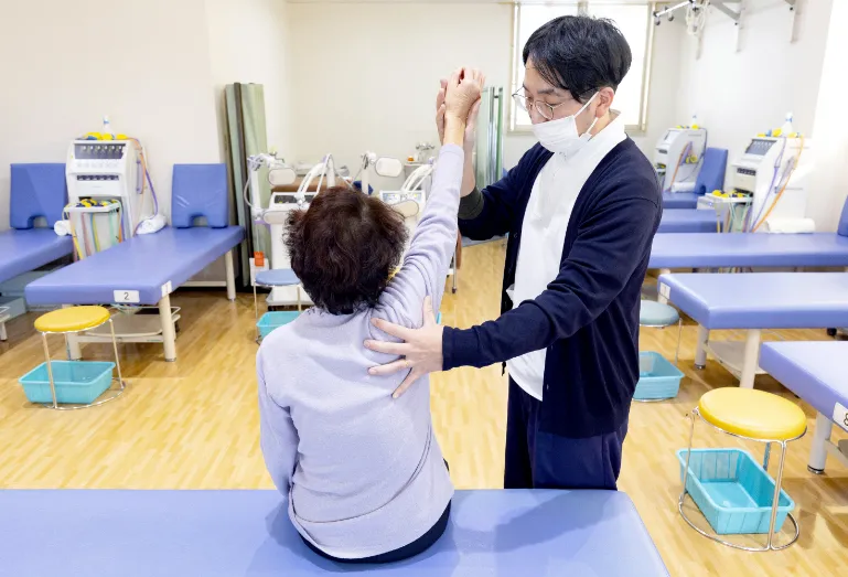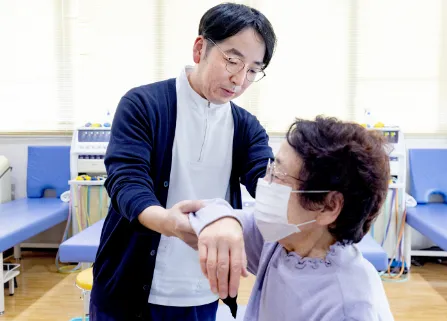 当院では、立つ、座る、歩くといった基本的な動作能力の回復・改善をお手伝いする「理学療法士」と、食べる、飲む、物をつかむ、着替えるといった日常生活の困りごとや職業関連活動の改善を支援する「作業療法士」が勤務しています。理学療法士と作業療法士によるきめ細かいサポートで、患者さまの「生活の質」の維持・改善を図ります。