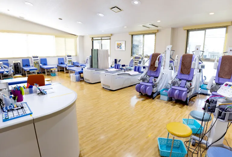 リハビリ室は広々とした空間で、多くの患者さまが同時に利用可能です。